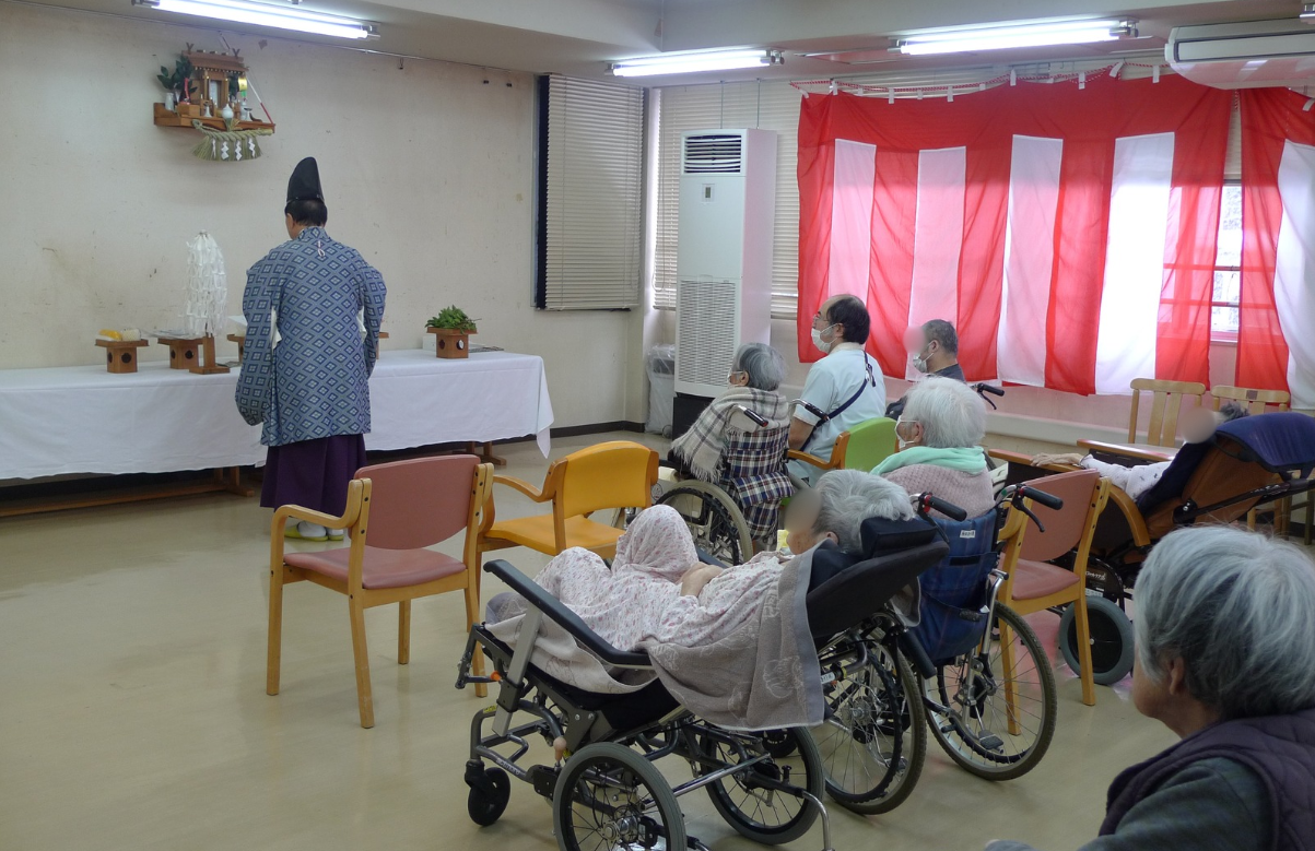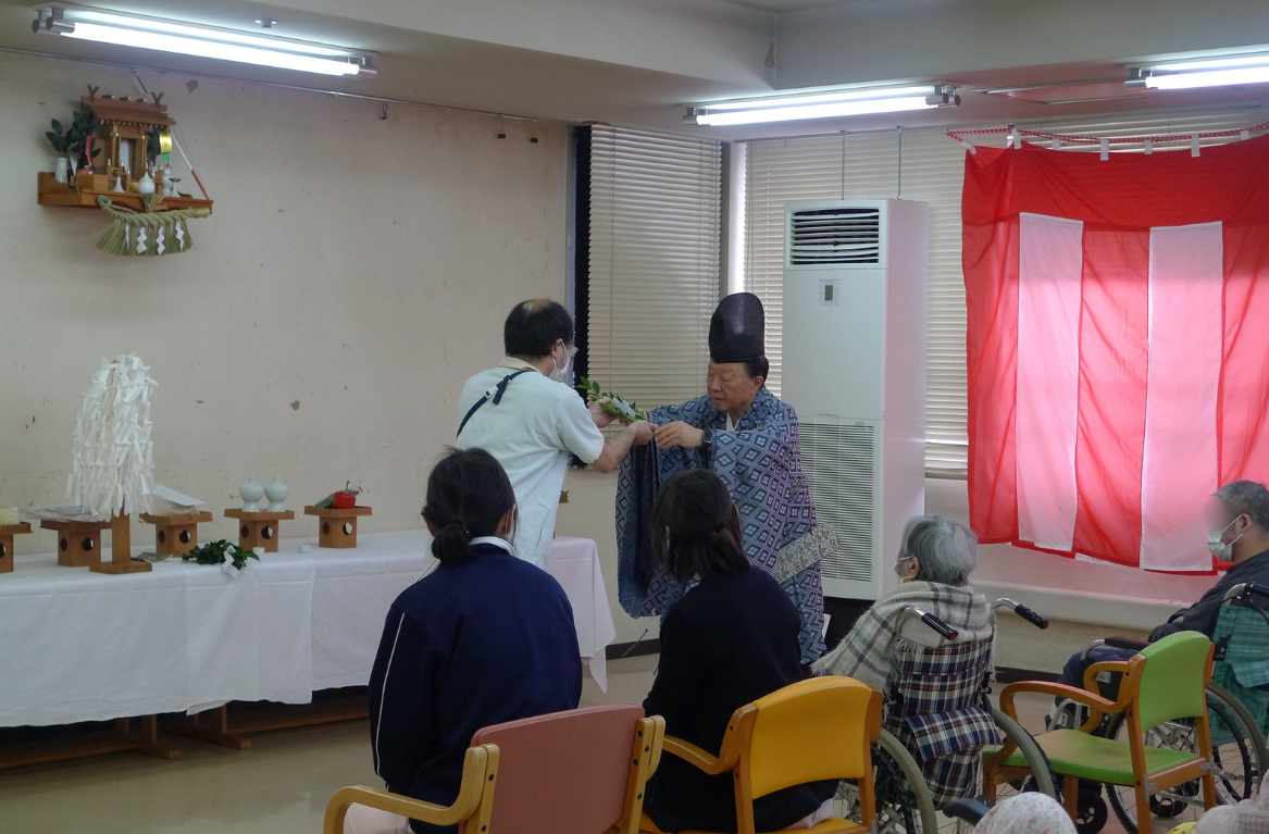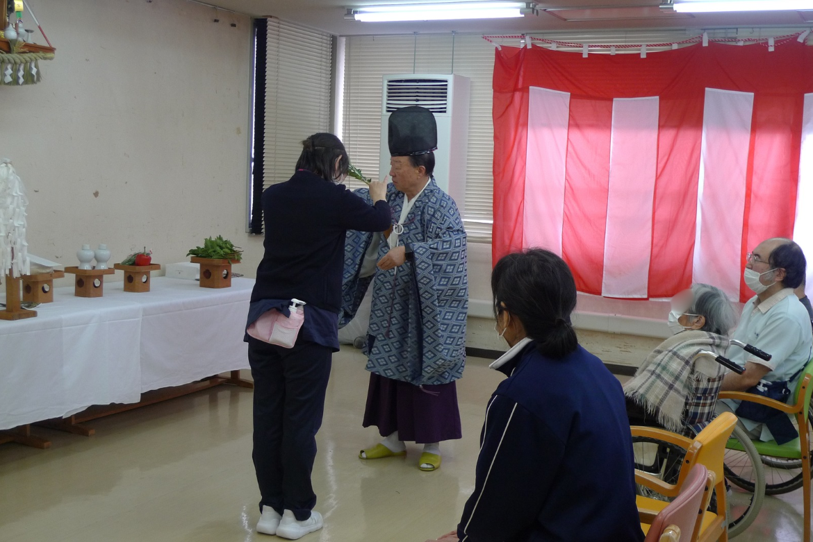 神棚への祝詞や、園内の隅々まで丁寧にお祓いをしていただき、身の引き締まる思いです。本年の干支である『午年』生まれの入所者様と職員が代表して祭壇に玉串を捧げ、清々しい空気の中で新しい年をスタートさせることが出来ました。