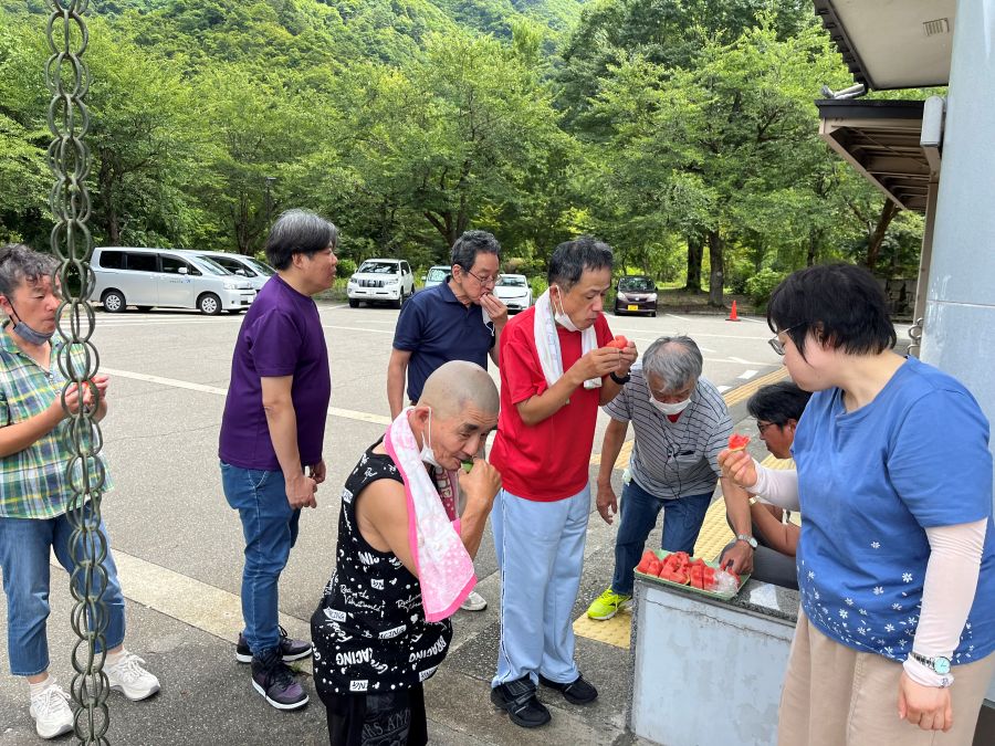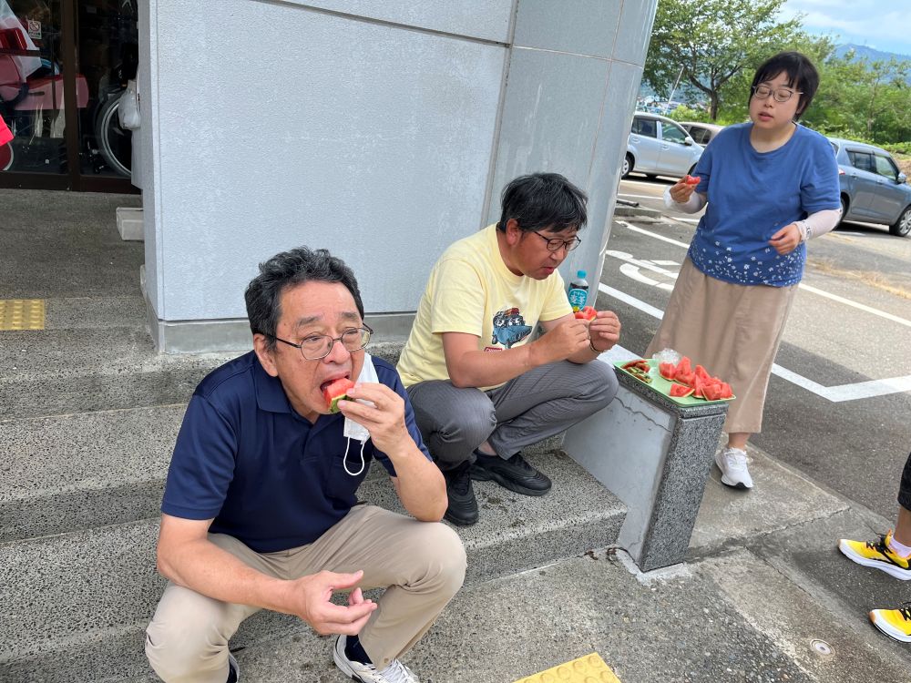 よーく冷えたおいしいスイカの差し入れをいただき、暑い中でしたが外に出て地活のメンバーでいただきました。みんなでがぶり!とかぶりついて食べるスイカは格別においしかったです。来年はスイカ割りに挑戦してみたいなぁ~と思うスタッフなのでした。来年のスイカの時期が今から楽しみです!