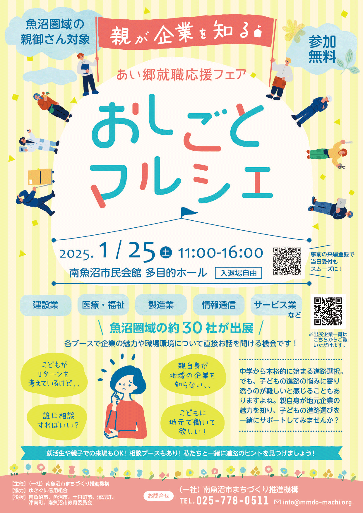 大学生・専門学校生・Uターンを考えている子供さんを持つ保護者様を対象にしたあい郷就職応援フェア「おしごとマルシェ」に南魚沼福祉会が参加します。魚沼地域の企業が約30社参加し、直接企業のお話を聞くことができる機会です。ご興味のある方は是非ご参加ください。